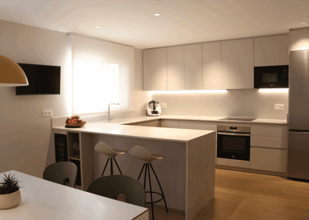 La nueva cocina en forma de U permite optimizar al máximo el espacio disponible, logrando una distribución eficiente y ergonómica de las zonas de trabajo. Este diseño de cocina moderna mejora la circulación, aumenta la capacidad de almacenamiento y favorece una organización práctica, respondiendo a las necesidades actuales de uso diario. La elección de materiales y acabados refuerza una estética contemporánea, funcional y duradera.